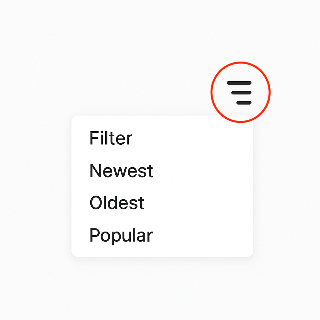 줄의 길이가 점점 짧아지는 모양의 아이콘으로, 추가옵션이나 숨겨진 기능의 목록, 필터 그룹 옵션을 제공하는 버튼