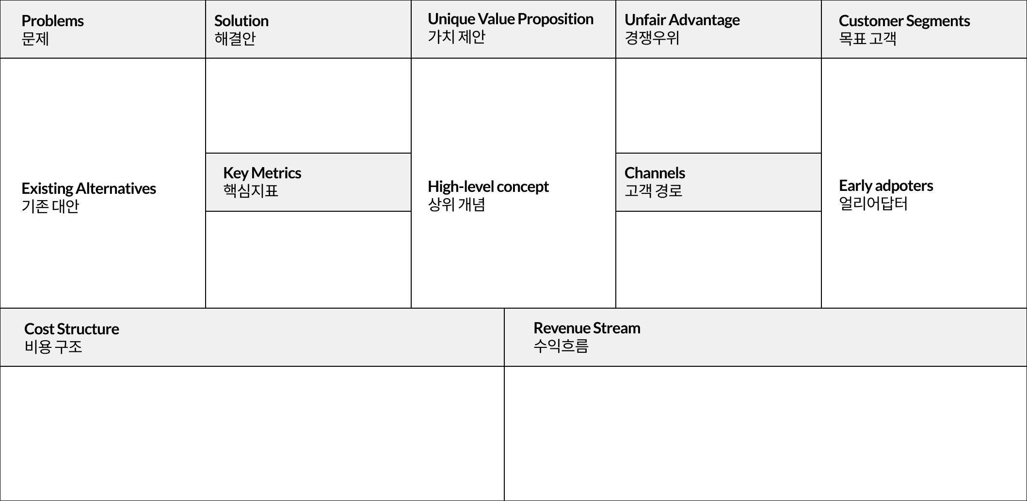스타트업 창업가인 Ash Maurya가 기존의 비즈니스 모델 캔버스를 스타트업에 더 적합하도록 리디자인한 프레임워크