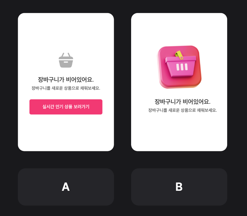A는 빈 장바구니에도 버튼을 삽입하여 유저의 또 다른 진입을 유도하는 디자인이다.