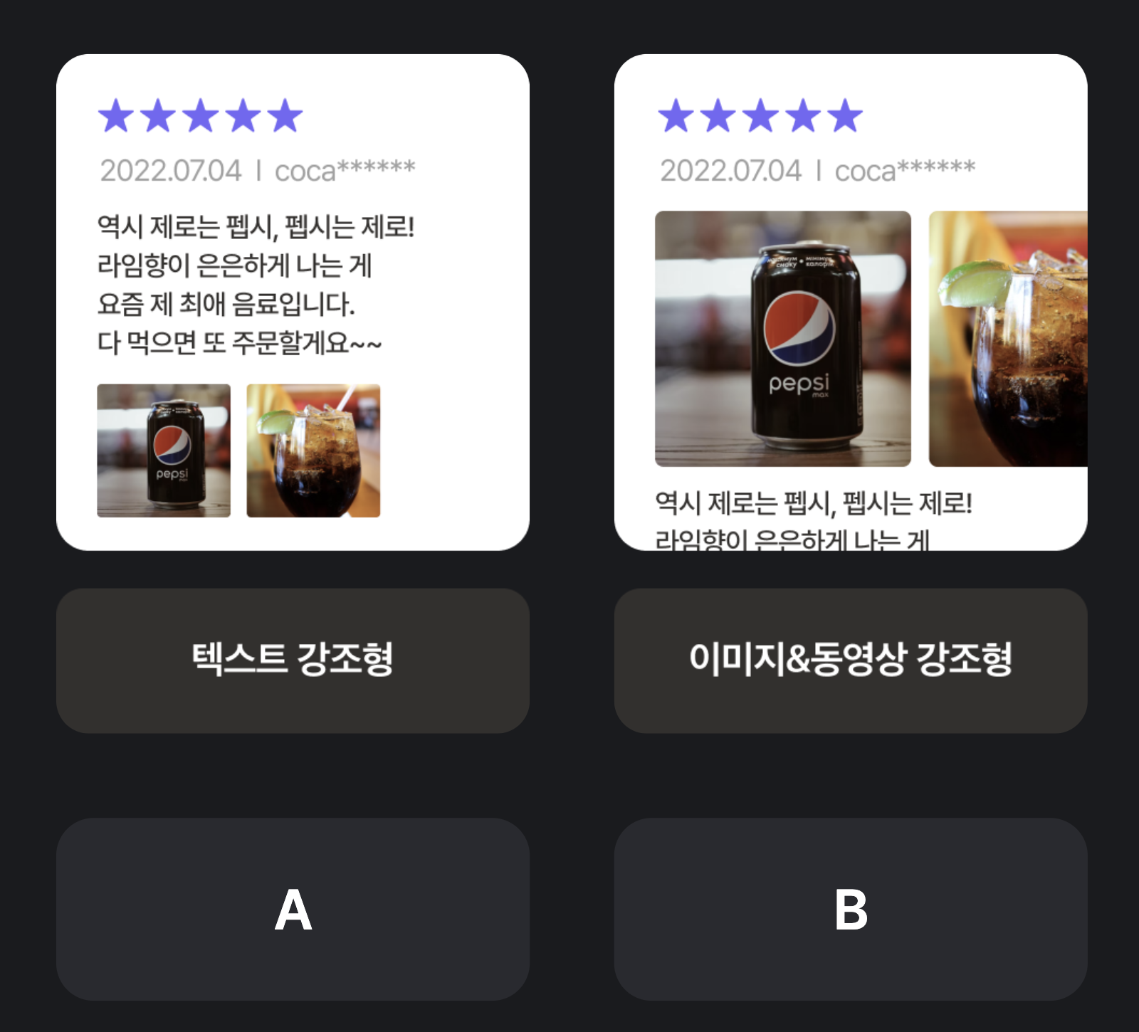 전체적으로 배달 서비스에서 사용자들을 실제 비주얼보다, 배달/맛/서비스 등에 대한 구체적인 텍스트 리뷰를 더 자세히 살펴보는 경향이 있을 것이다. 그렇다면, 사진보다 글을 상단에 위치하게 하는 것 = A 가 좋을 것이다.